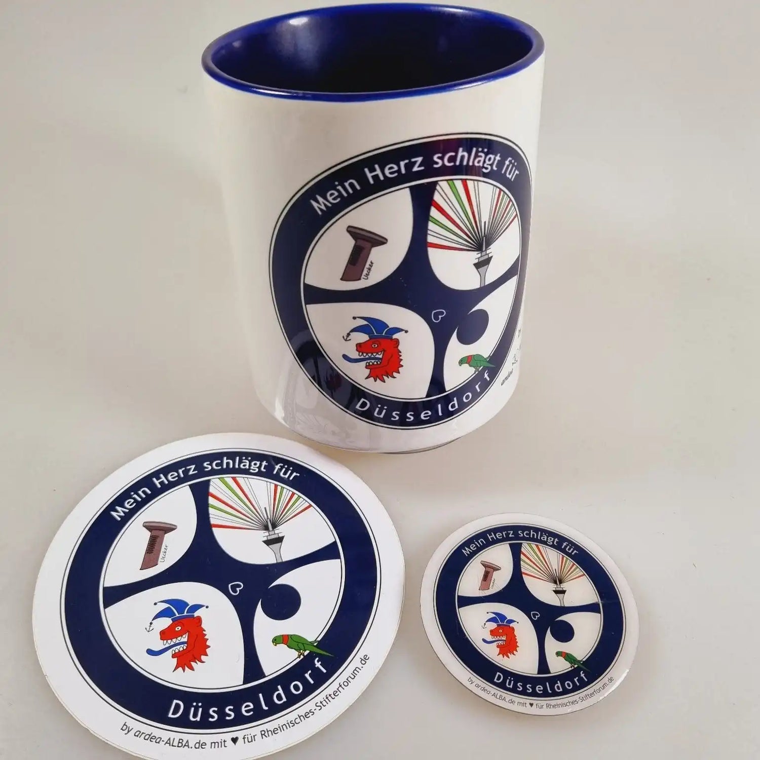 Bringen Sie ein Stück Düsseldorfer Heimatgefühl an Ihren Arbeitsplatz oder in Ihre heimische Küche. Diese elegante Keramiktasse besticht durch ihr puristisches Design: Der klassisch-blaue Henkel und der farblich passende Rand setzen einen stilvollen Akzent zum strahlenden Weiß der Tasse und dem markanten Radschläger-Motiv.